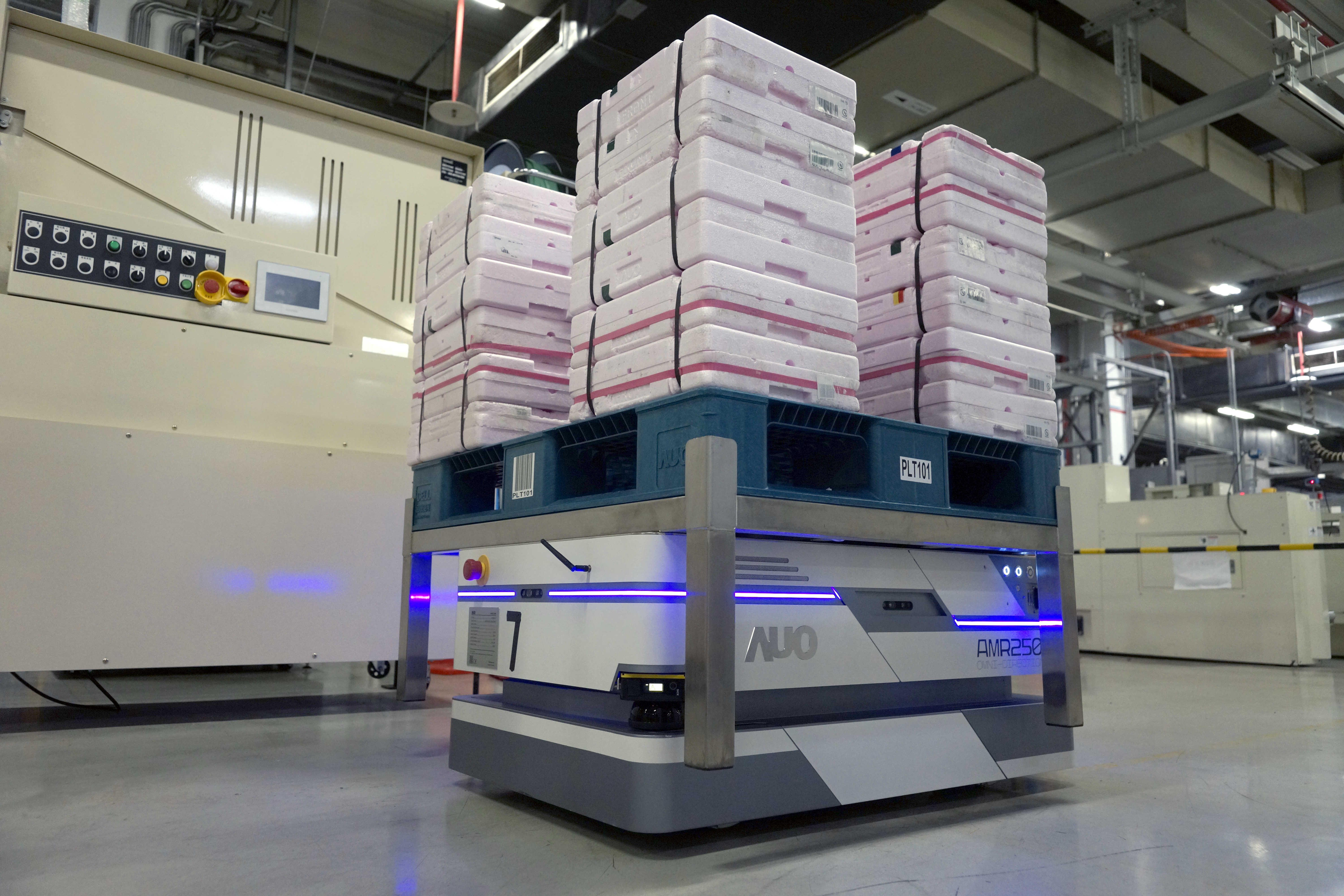 世界杯下单平台网站官网运用数字孪生系统,结合AMR无人搬运车进行派送,达成低库存高效率的智能化仓储物流管理。